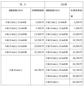 片道65㎞以上の距離の上限を引き上げて区分を新設、非課税限度額の引上げ